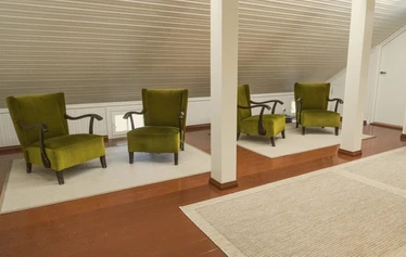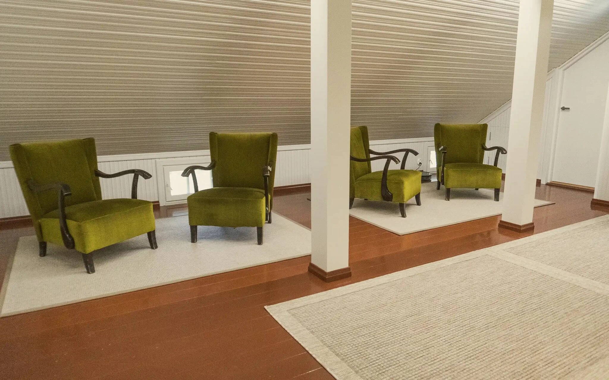 Yläaulan neljä nojatuolia asettuvat vastakkain kuin hiljainen lupaus yhteisestä olohuoneesta. Portaista nouseva askel hidastuu kuin itsestään, kun huomaa, että tähän voi jäädä – lukea hetken, jutella tai vain olla matkalla Turen ja Märttan huoneiden välillä.