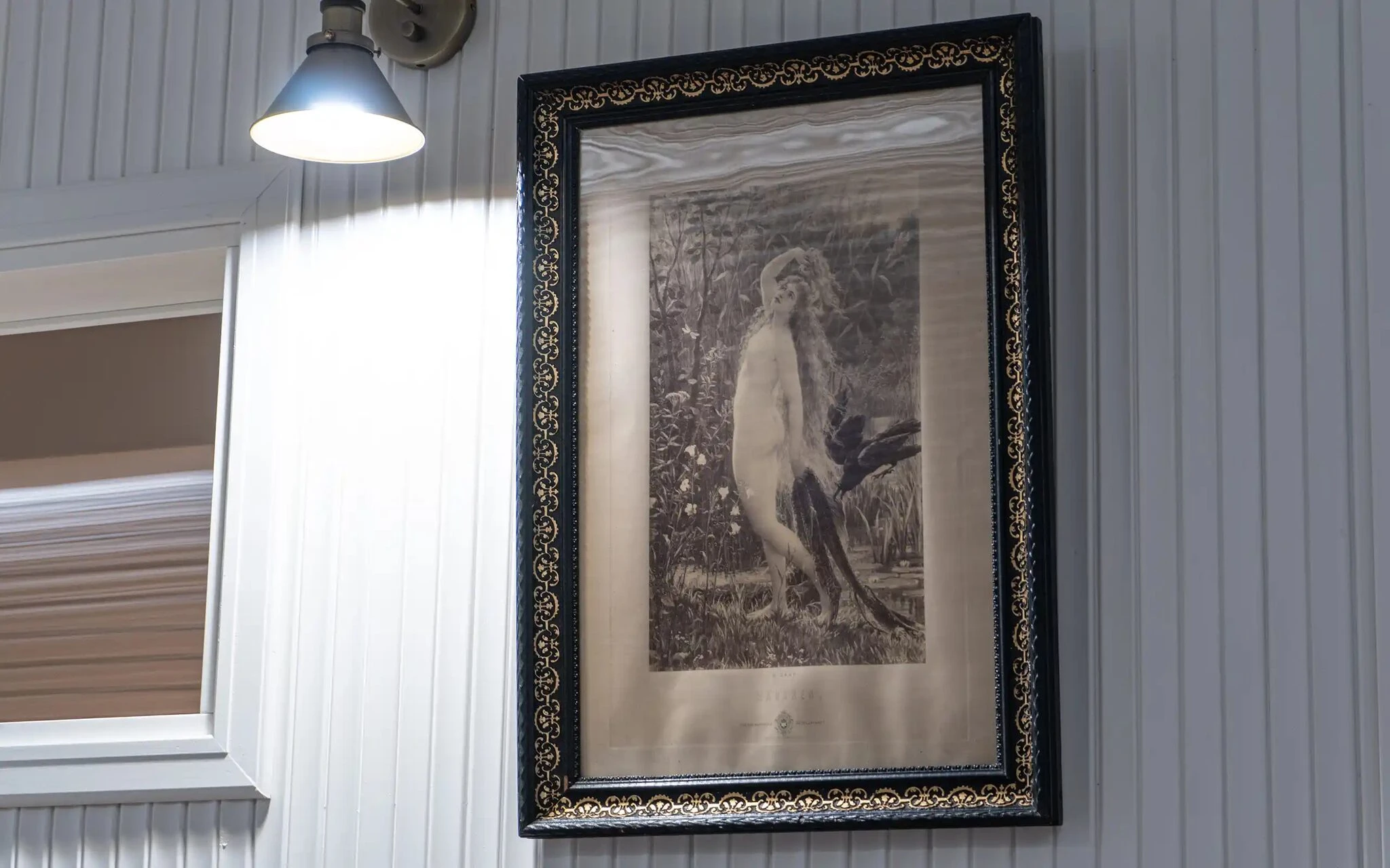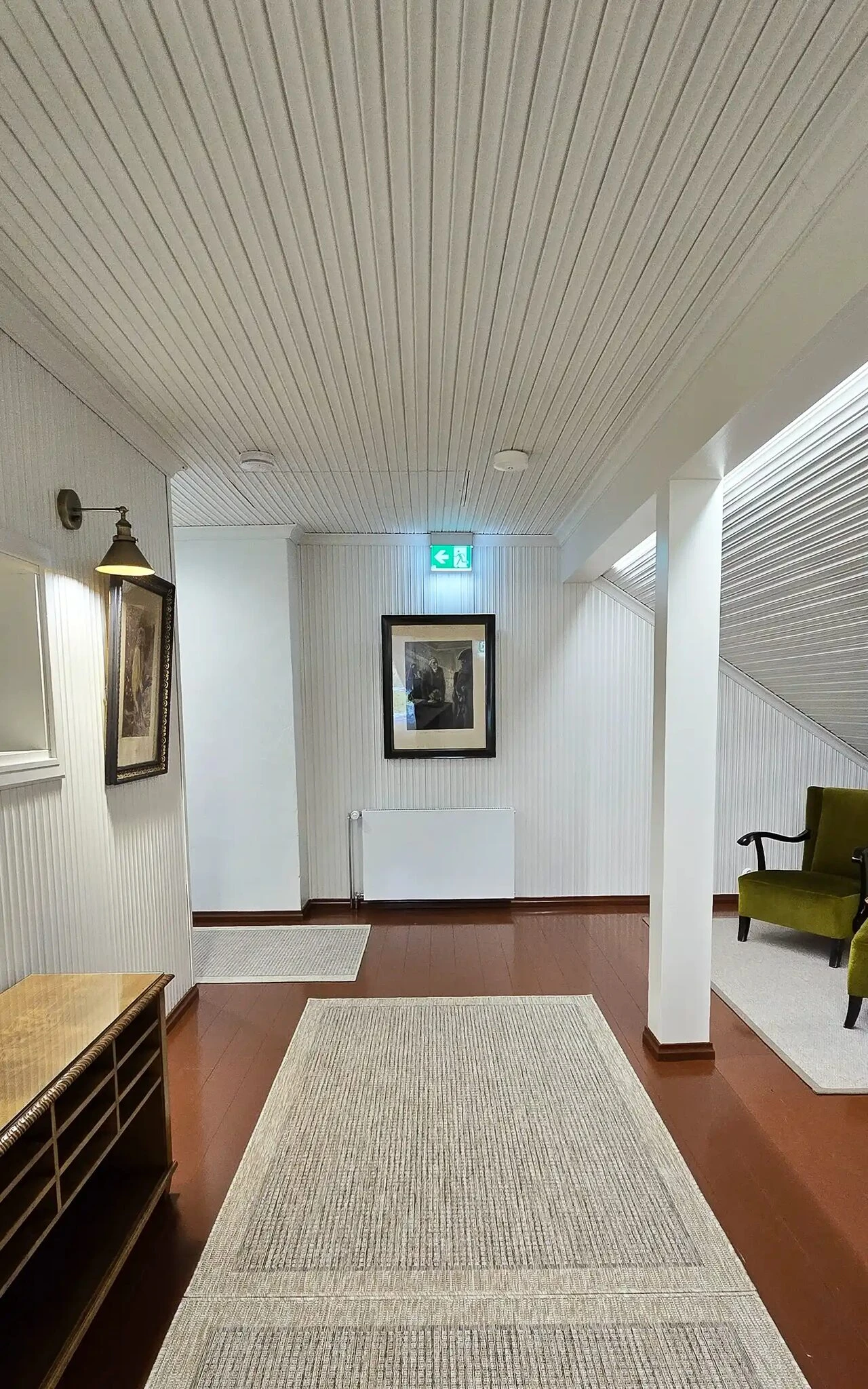 Yläkertaan syntyy oma maailmansa: kahden majoitushuoneen yhteinen tila, jossa ilta venyy vielä yhdellä tarinalla.